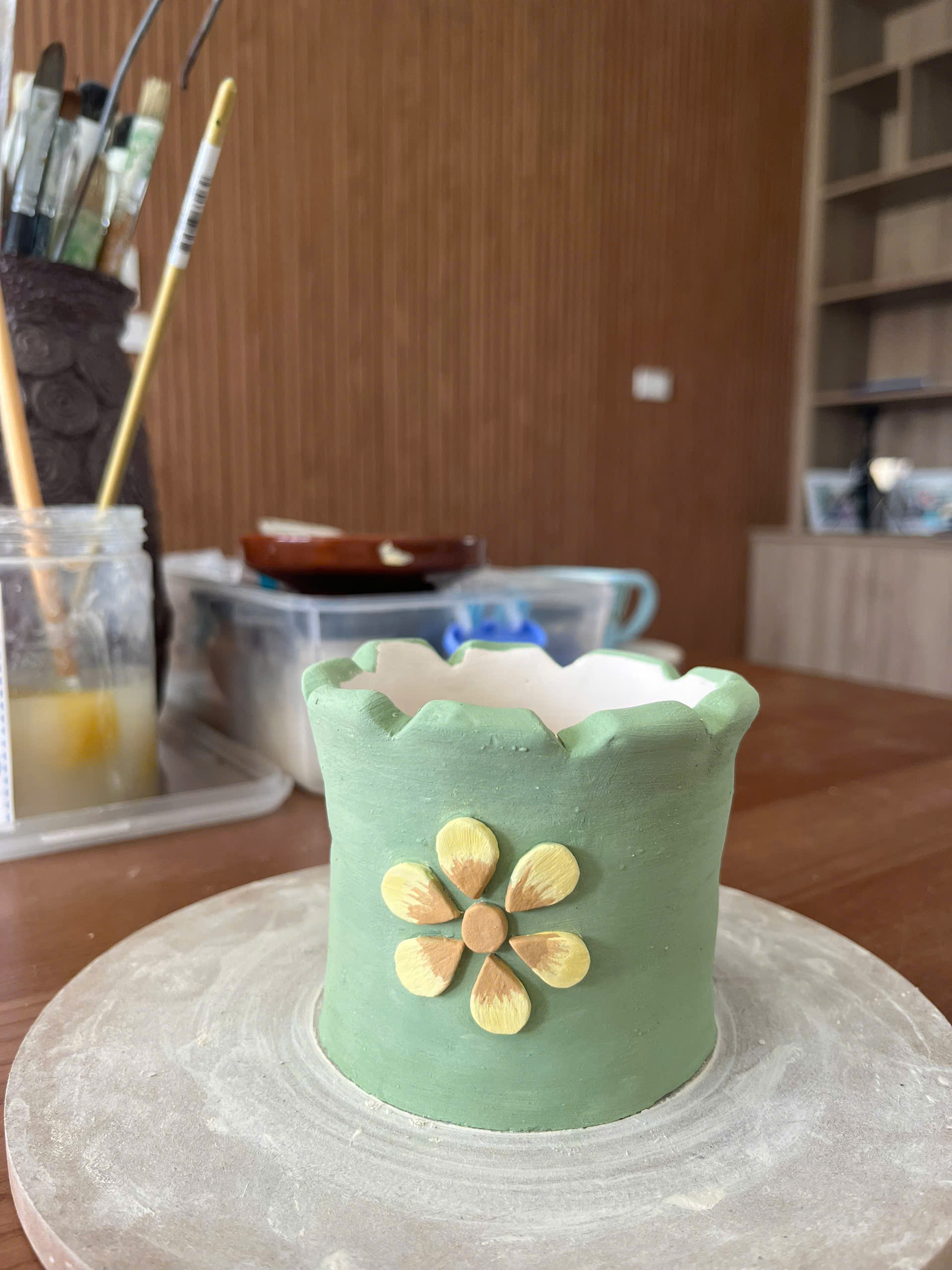 Cảm giác chạm vào bề mặt gốm đã khô thật đặc biệt – mộc mạc, thô ráp nhưng cũng rất sống động. Mỗi nét cọ vẽ lên không chỉ là màu sắc, mà còn là một phần tâm hồn mình được gửi gắm. Mình chọn những gam màu nhẹ nhàng để giữ được sự tinh tế và gần gũi. Một chiếc cốc có tên Kala viết tay, một chiếc bình hoa mang hình bông cúc vàng nhạt – tất cả đều mang cảm giác “rất riêng”.