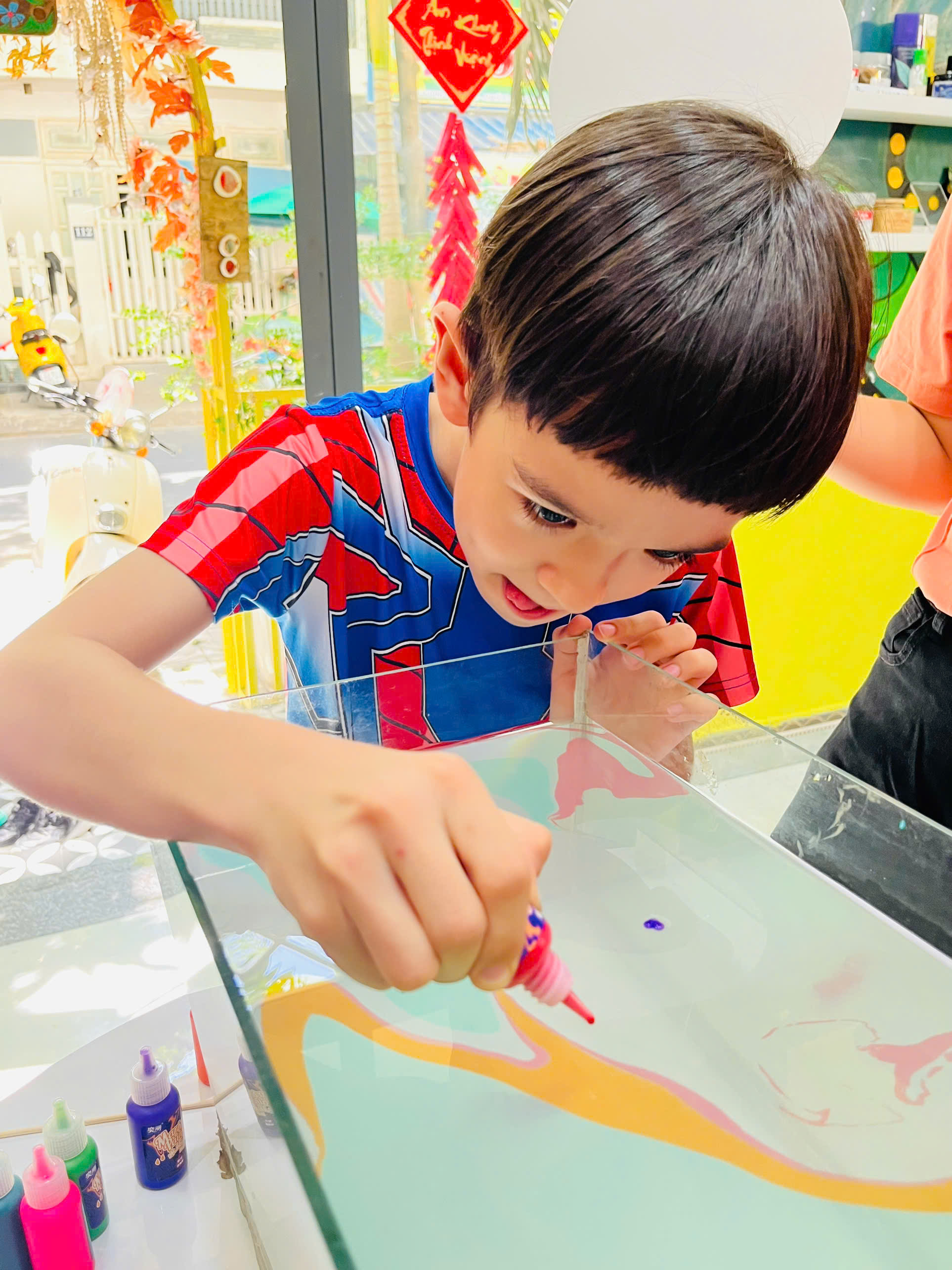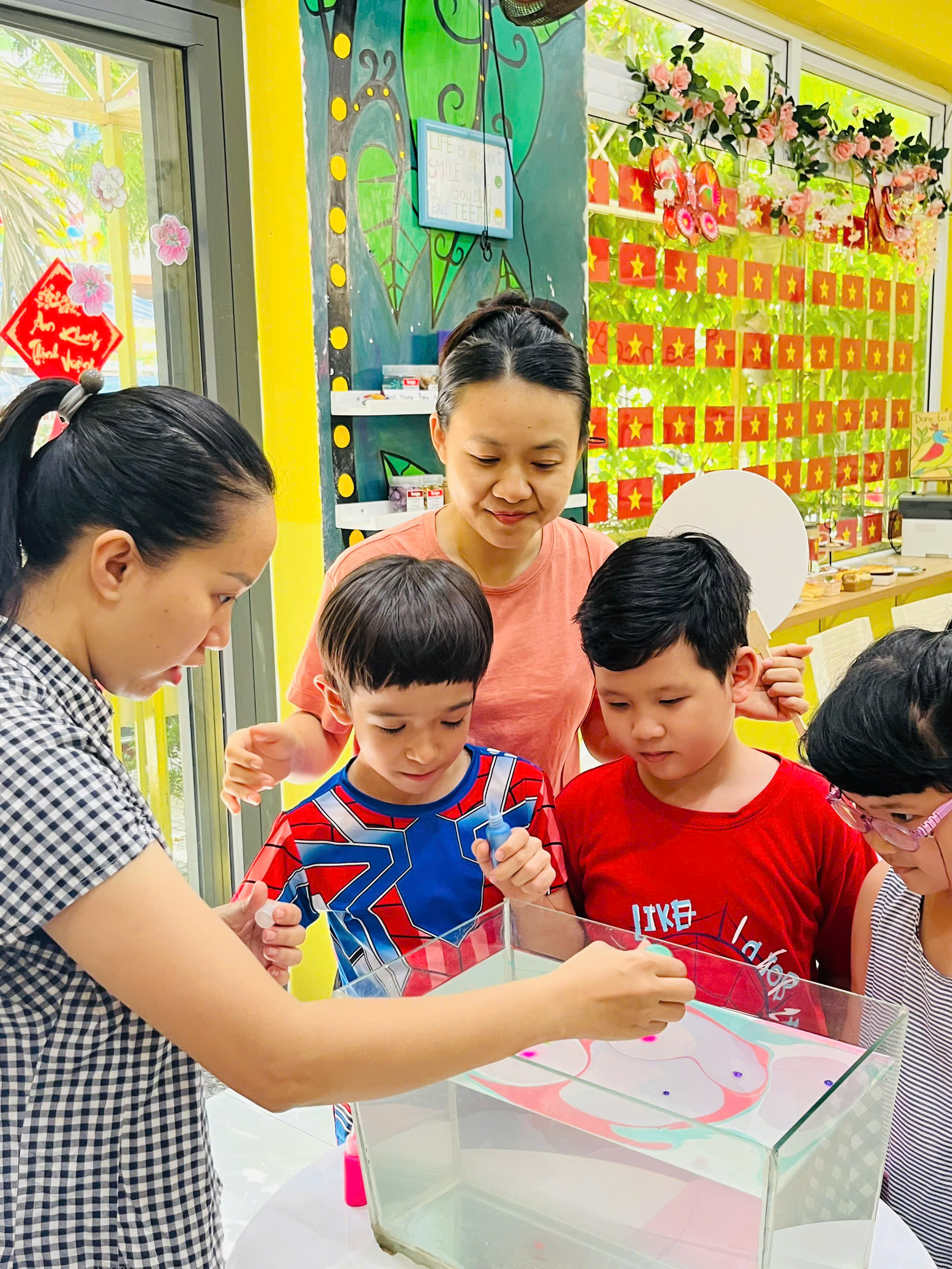- Tự tay chọn màu, pha chế và sáng tạo họa tiết trên mặt nước