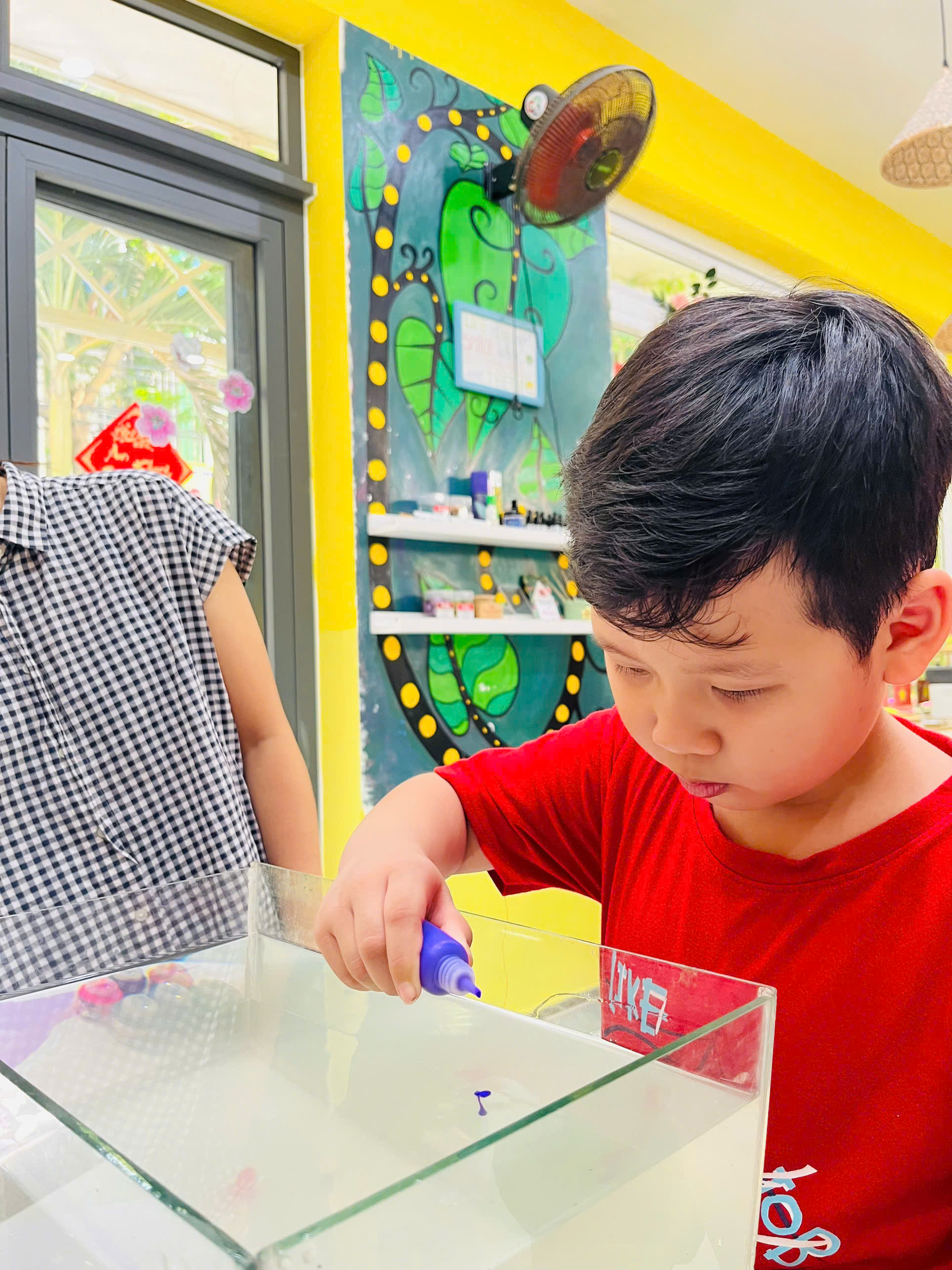 Thủy ấn (Ebru) là kỹ thuật tạo hình trên mặt nước bằng cách nhỏ màu chuyên dụng, sau đó vẽ trên bề mặt nước và in hình lên giấy hoặc chất liệu khác. Các bạn nhỏ đã vô cùng thích thú khi thấy màu sắc loang ra như phép màu, rồi nhẹ nhàng tạo nên những đường vân sống động 🌊✨.