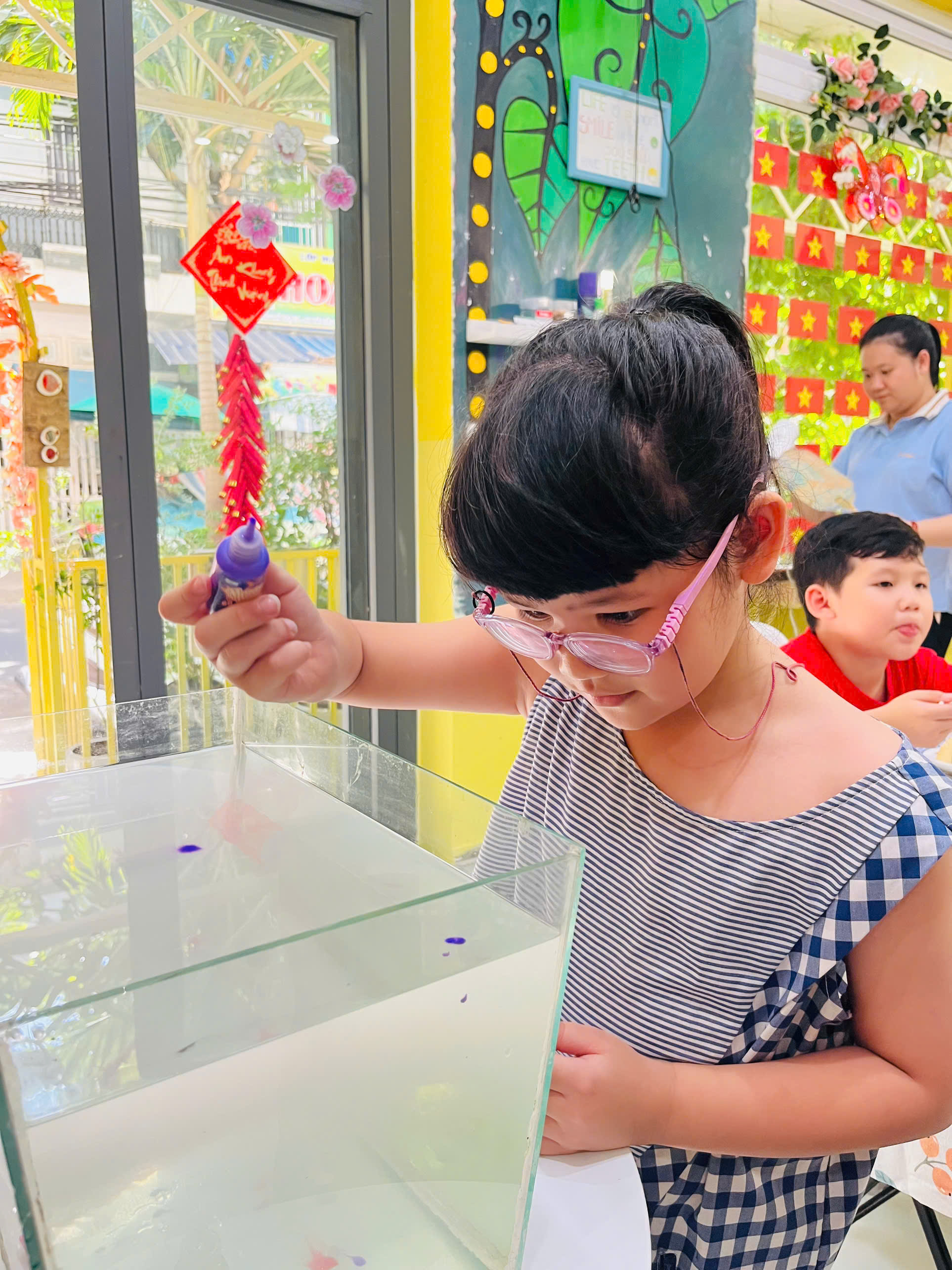 - Ánh mắt tròn xoe vì ngạc nhiên khi thấy màu loang ra trên nước 😯