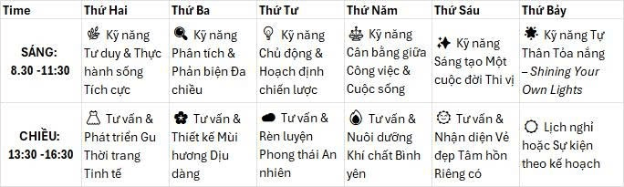 Buổi sáng các ngày trong tuần, chúng tôi tập trung phát triển 6 nhóm kỹ năng cốt lõi giúp bạn làm chủ bản thân – công việc – cuộc sống. Buổi chiều các ngày trong tuần, chúng tôi tập trung vào thực hành, chuyển hoá nội lực thành phong cách sống và vẻ đẹp khí chất.