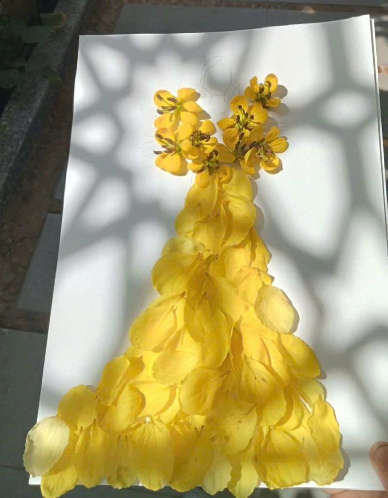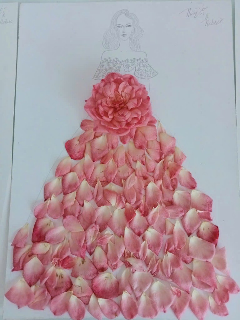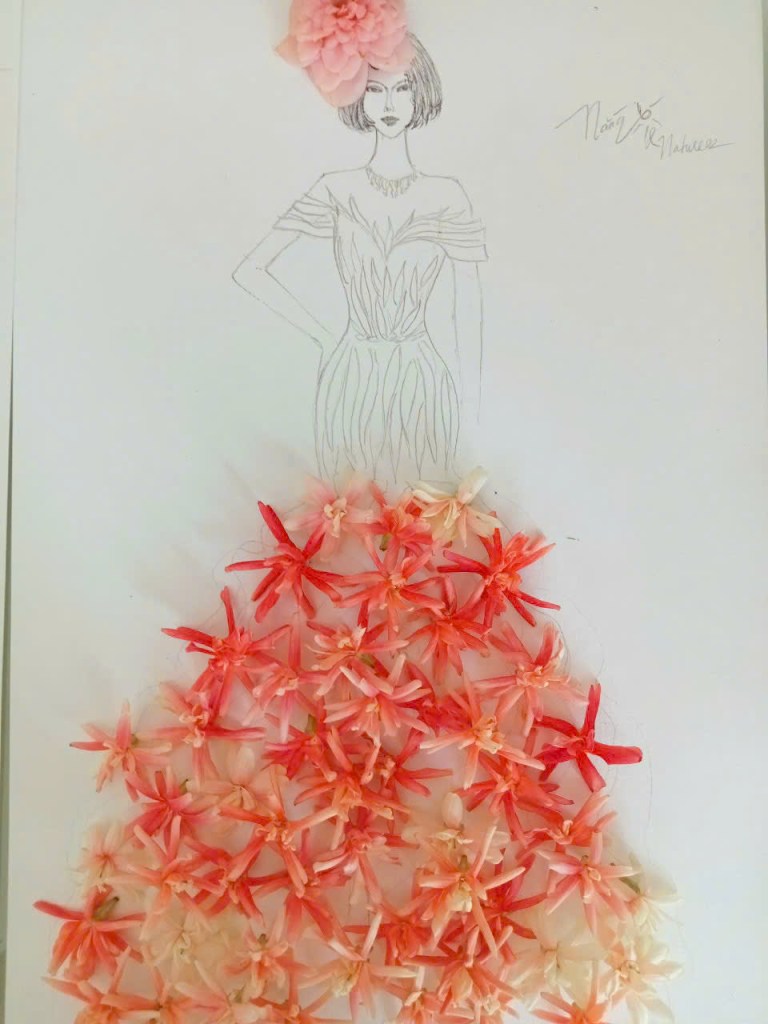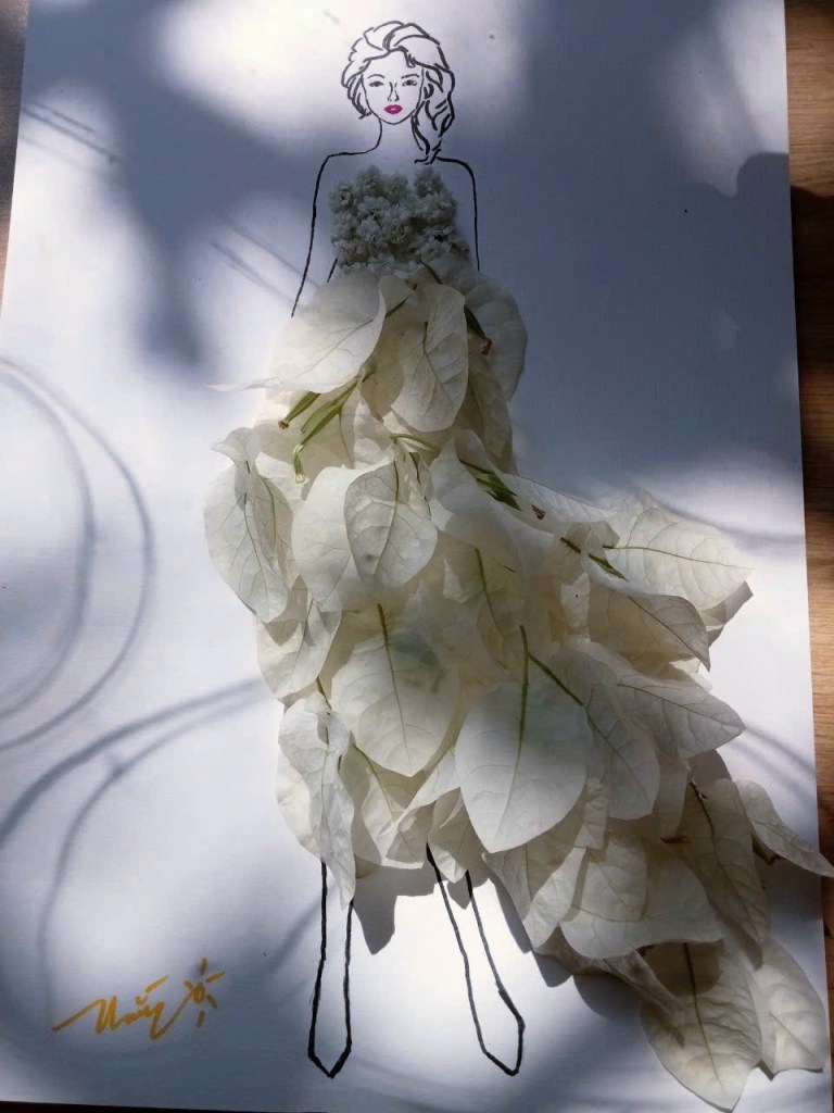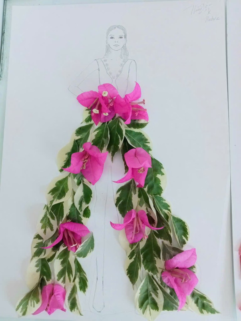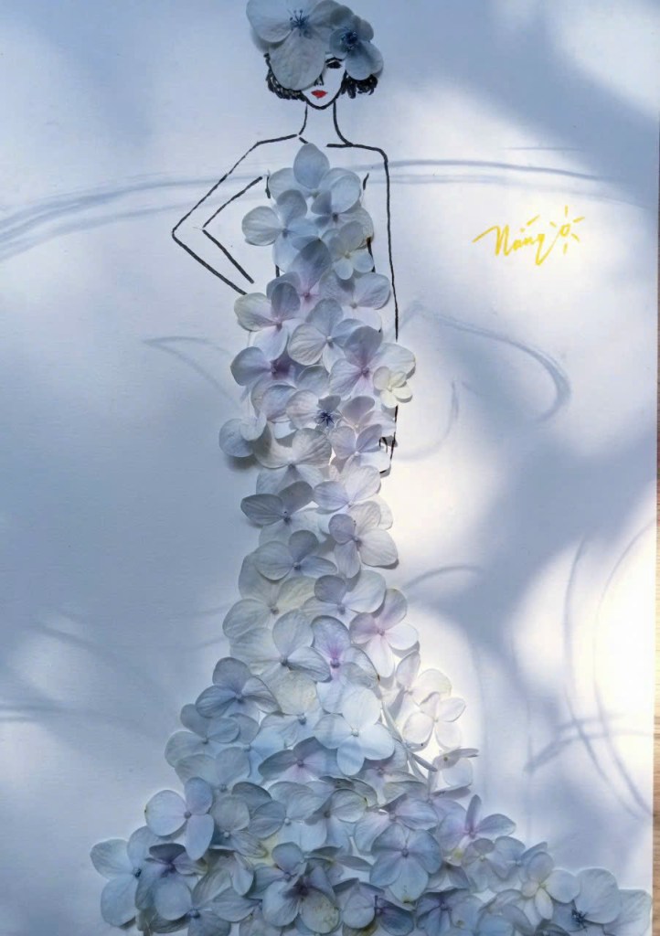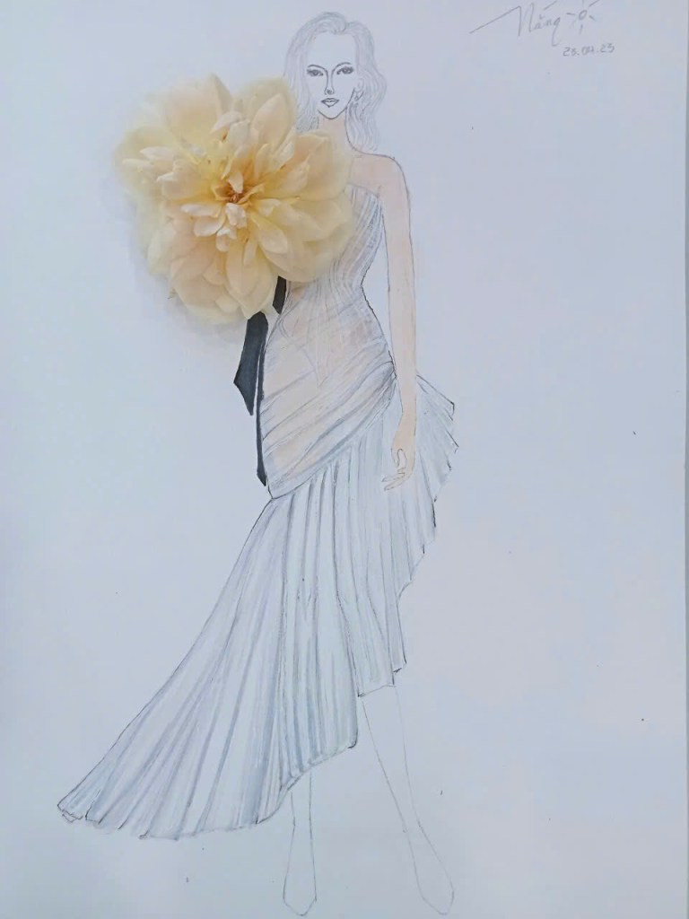 Mỗi chiếc váy trong bộ sưu tập “Sắc Hạ” không chỉ là một thiết kế, mà là một bản hòa ca giữa đường nét con người và vẻ đẹp thuần khiết của cỏ cây hoa lá. Những phác thảo thời trang tay kết hợp cùng chất liệu thật từ thiên nhiên đã tạo nên một loạt tác phẩm vừa mong manh, vừa sống động – như chính mùa Hạ.
