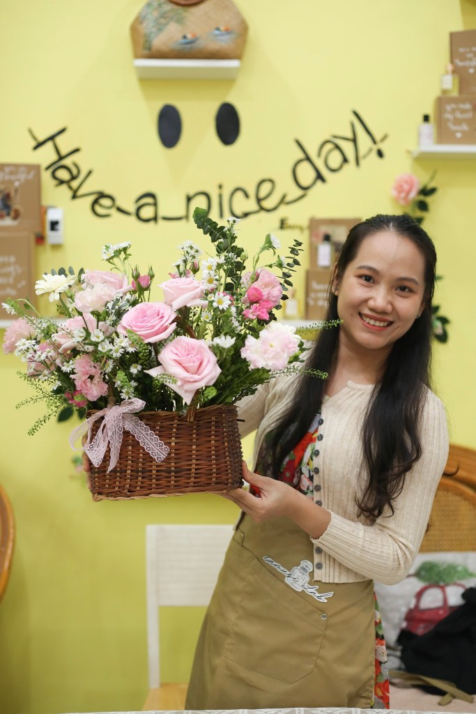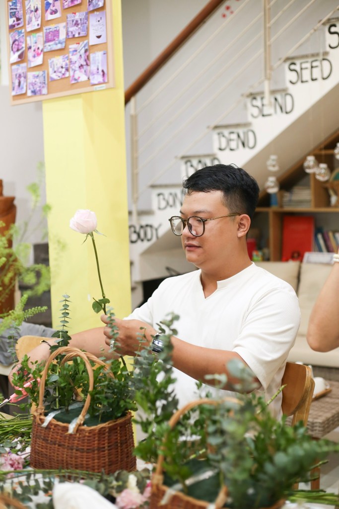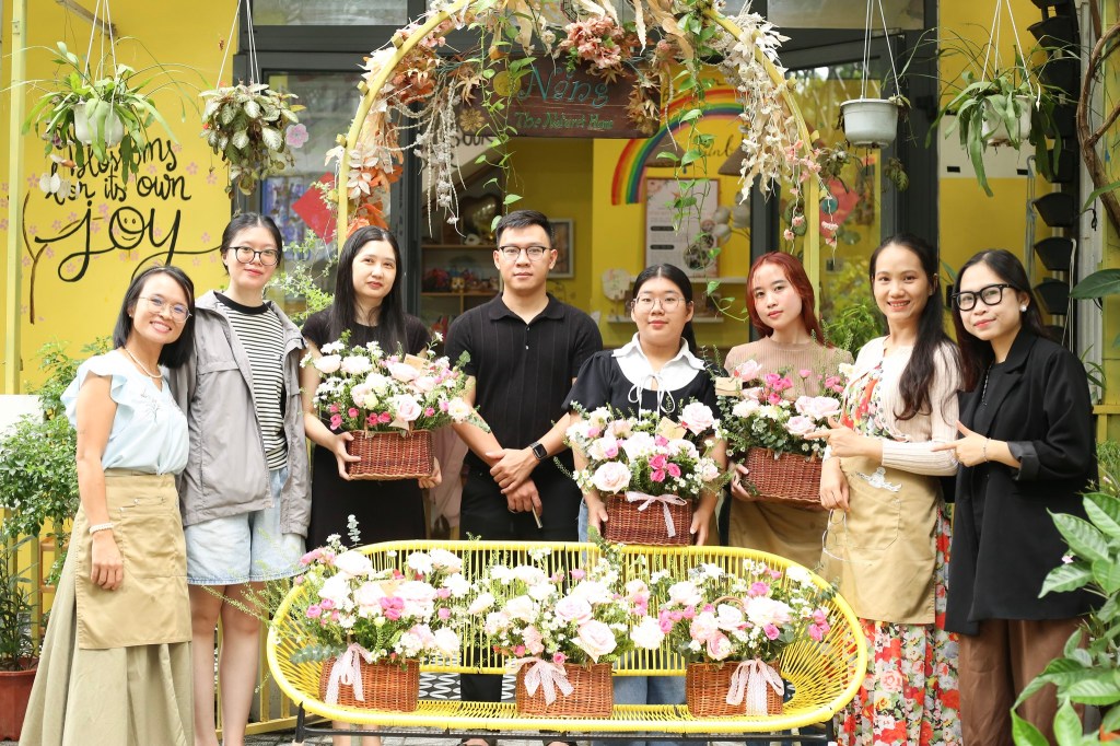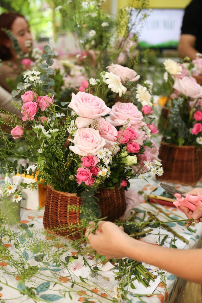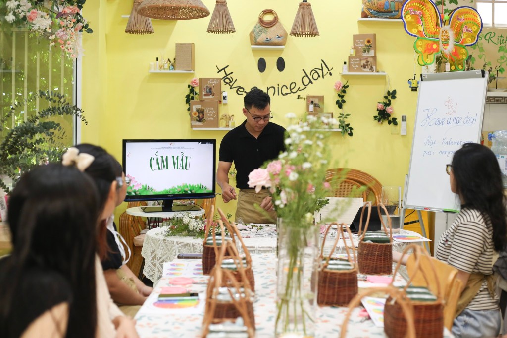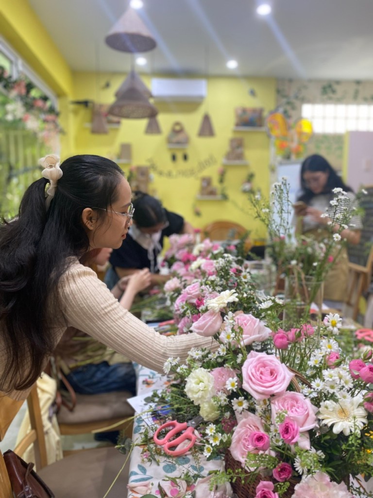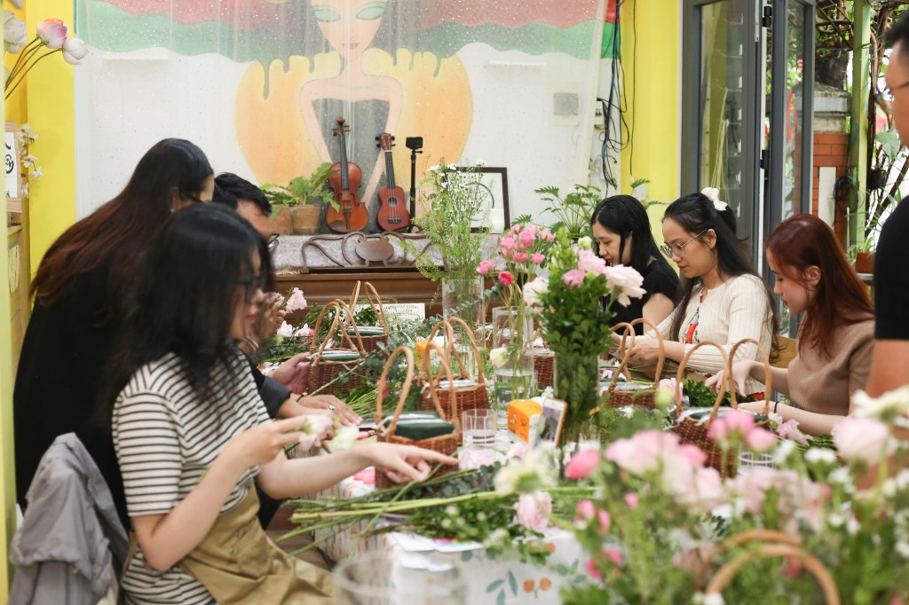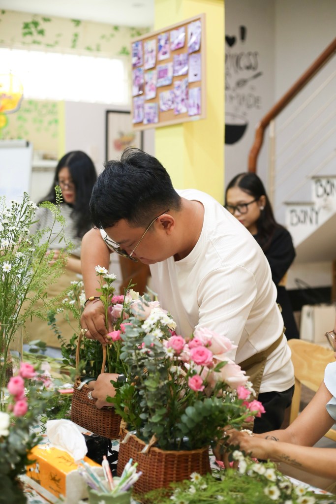 Mỗi người đến với workshop không chỉ để cắm hoa, mà để lắng mình trong những phút giây tỉ mỉ – nơi từng cành hoa, chiếc lá được sắp đặt bằng cả sự yêu thương, để kết thành món quà ý nghĩa dành tặng người phụ nữ đặc biệt của mình.