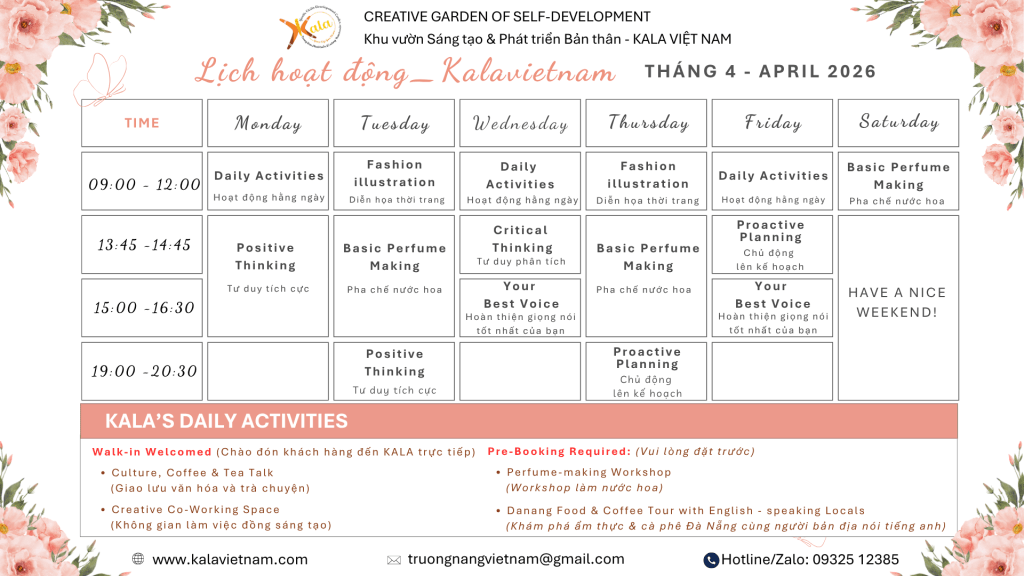 Tháng 4 này, KALA tiếp tục mở ra một nhịp sống dịu dàng nhưng đầy cảm hứng – nơi bạn có thể ghé vào bất cứ ngày nào trong tuần để học, để chơi, và để quay về với chính mình.