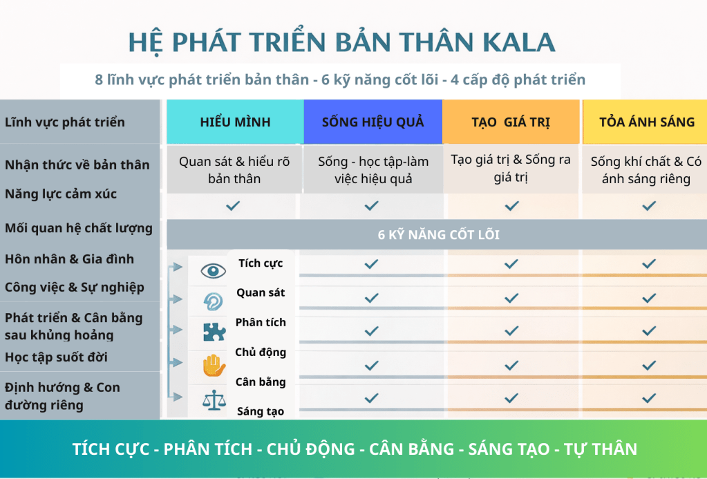 Tất cả nhằm giúp bạn hiểu bản thân – chuyển hóa – và thực hành kĩ năng kĩ năng cốt lõi để chủ động cải thiện chất lượng trải nghiệm sống.